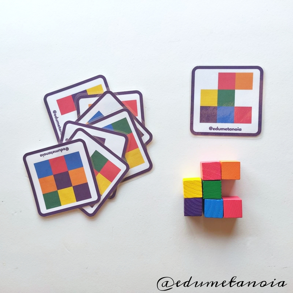 El objetivo es coger una de las tarjetas y reproducir el patrón que aparezca en ella con los cubos de madera u otro elemento.